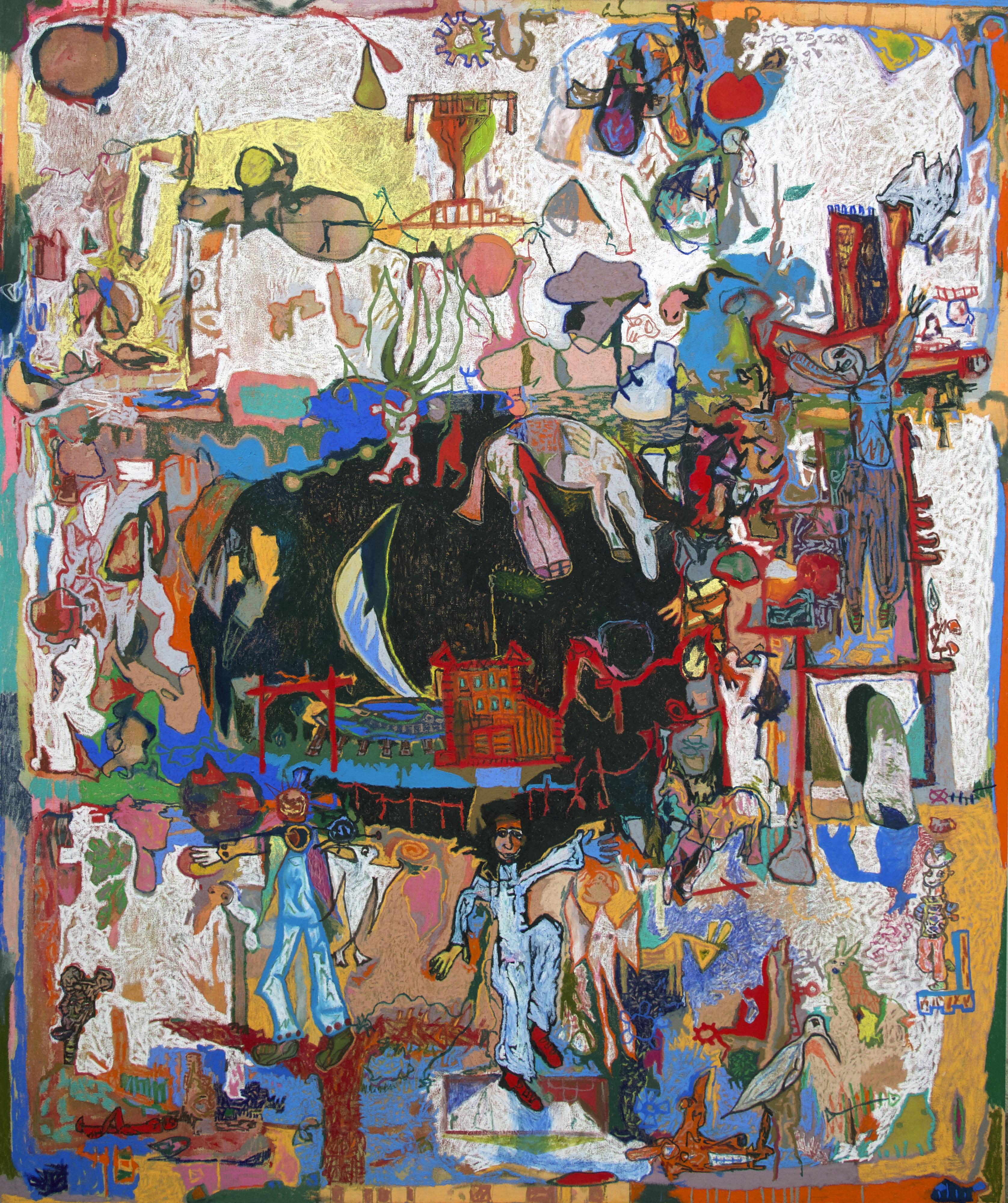 Atrocity Exhibition, 2024, oil and oil pastels on canvas, 280 x 200 cm