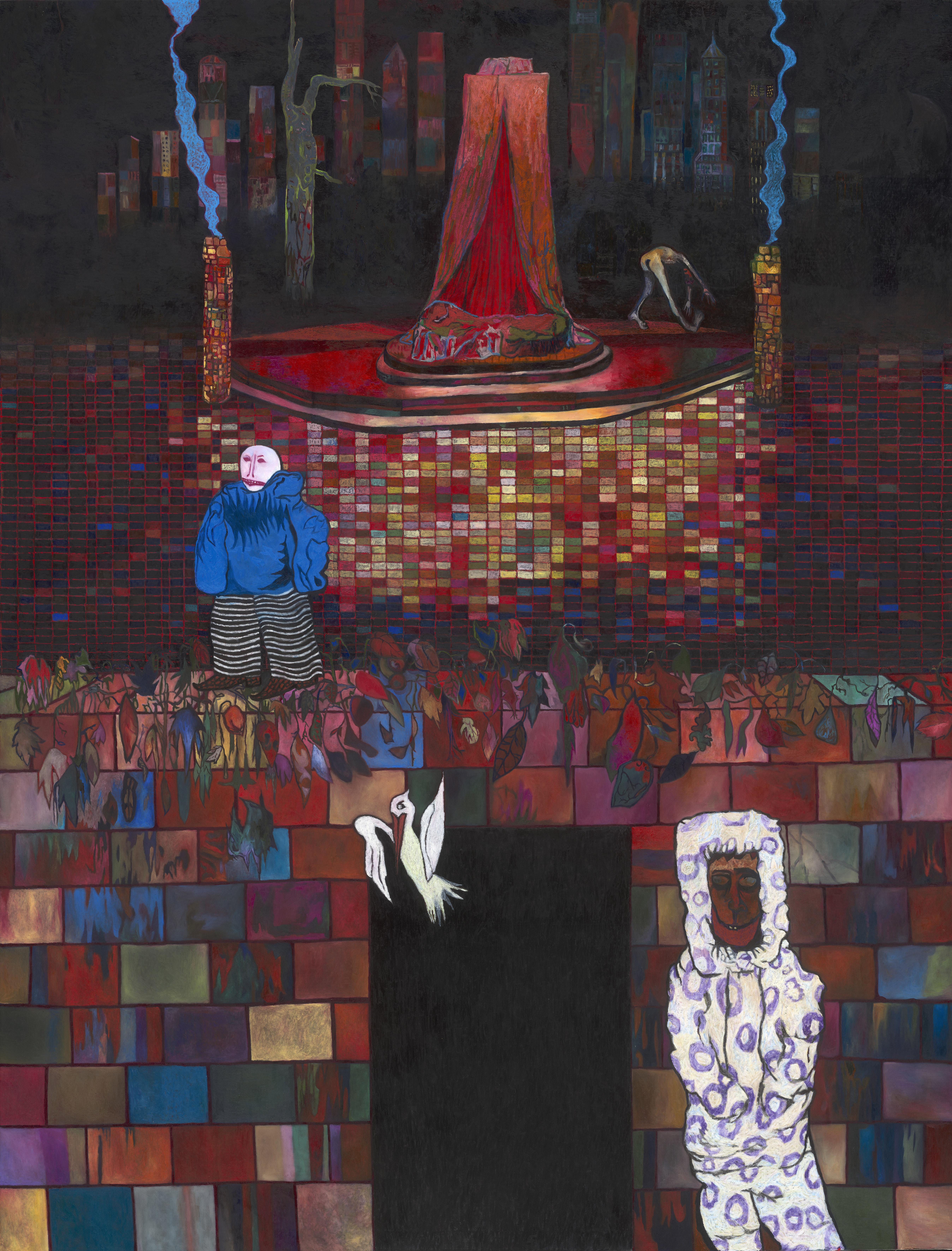 Public Square, 2025, acrylics, oil and oil pastel on canvas, 250 x 188 cm