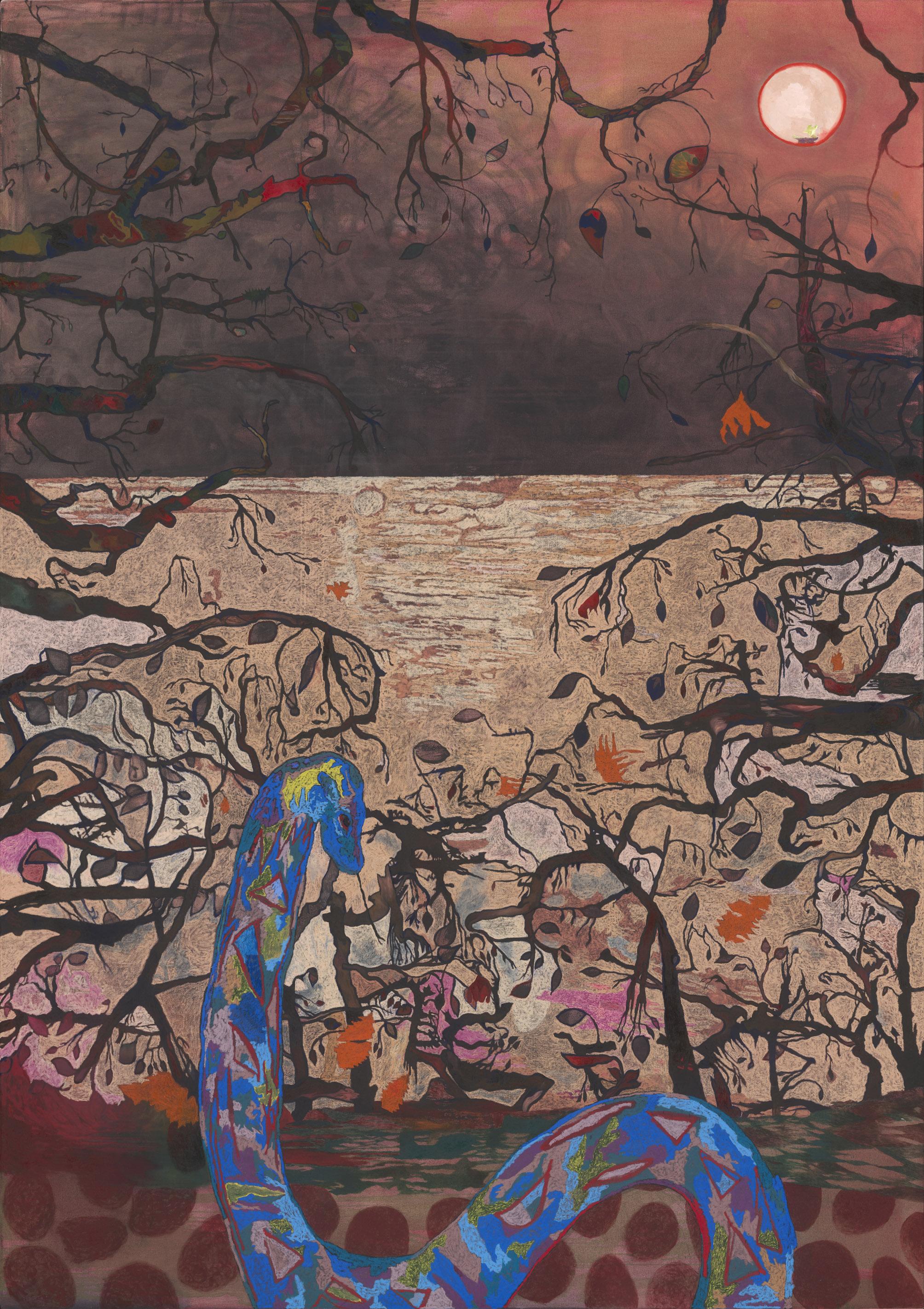 Empire of Sleep, 2021, acrylics, glue, pigments, oil and oil pastel on canvas, 180 x 150 cm