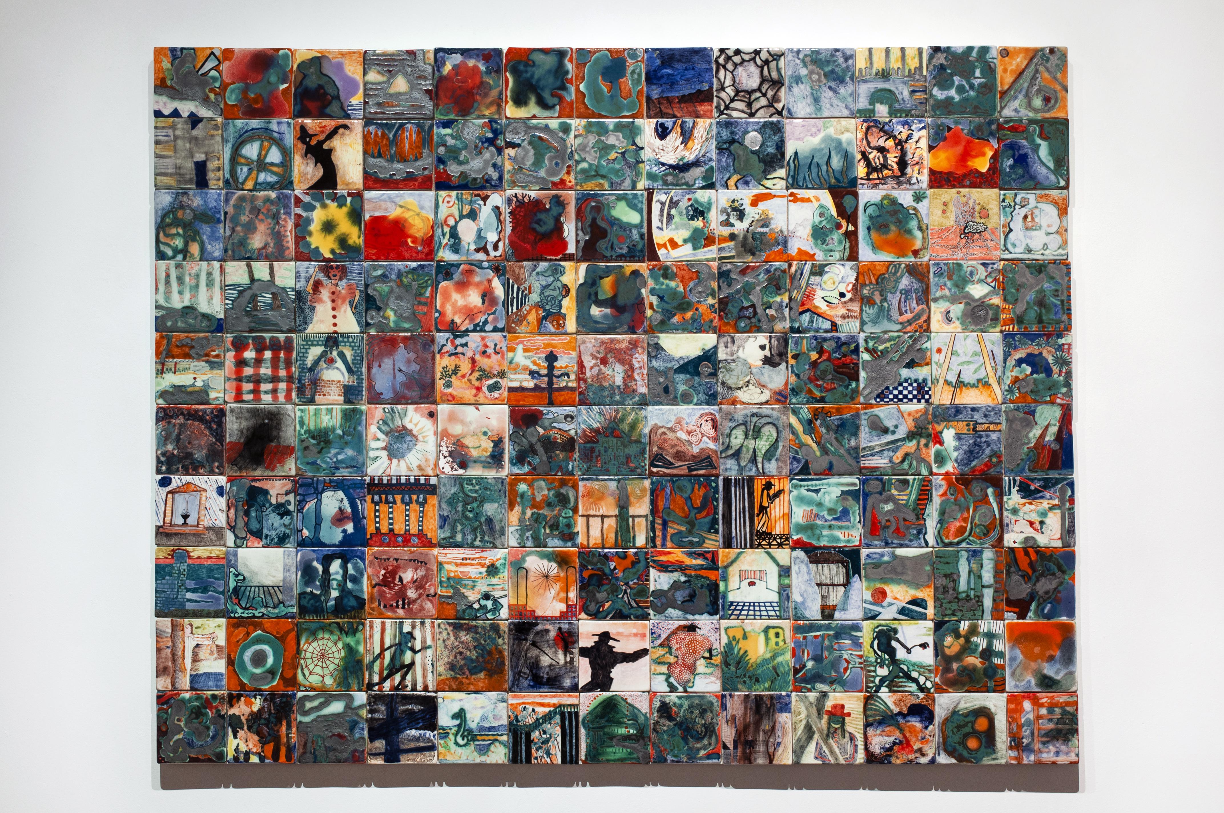 Dice of Life, 2017-2018, underglaze, glaze and oxides on ceramic tiles mounted on wooden board, 100 x 130 cm